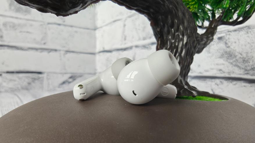 На спинке наушников выгравировано название производителя, а на верхней части спинки выделены сенсорные области кнопок. Хочу сразу отметить — это решение правильное, всегда приятнее пальцем нащупать кнопку, чтобы точно знать, что ты попал в сенсорную область. Наушники имеют полноценную профессиональную систему адаптивного шумоподавления, благодаря систем из 6 микрофонов (по 3 на каждый наушник). Отверстия микрофонов мы найдем за звуководом, между головкой и ножкой, и на самом нижнем торце ножки. Рядом с самым нижним микрофоном расположены еще симпатичные скругленные контактные площадки для зарядки. Звуководы овальной формы с явно выделенными ободками для крепления амбушюр прикрыты пластиковой стекой. На головке наушника обнаружим еще компенсационное отверстие.