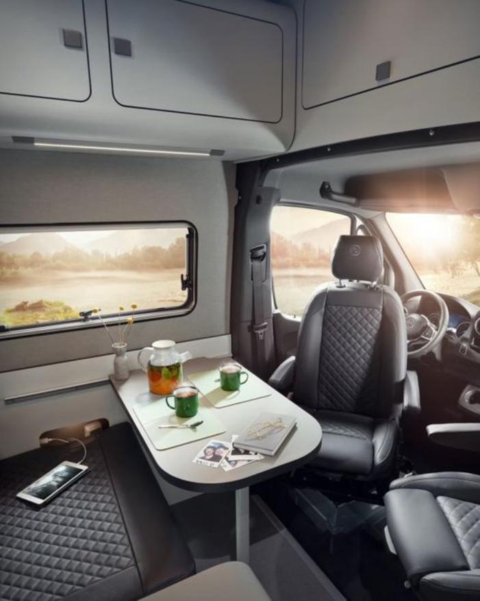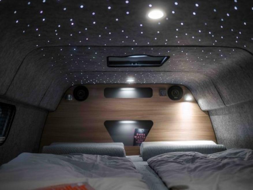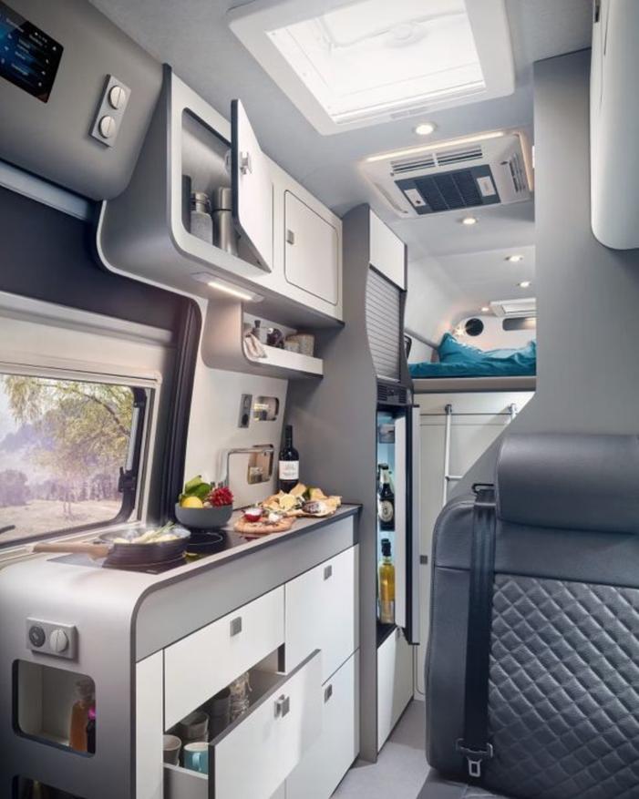 Внутреннее пространство кемпера имеет высоту потолков 2,10 метра и включает полноценную кухню с индукционной варочной панелью и 90-литровым холодильником. Спальная зона оборудована двуспальной кроватью и панорамными окнами. Для увеличения вместимости предусмотрена возможность установки палатки на крыше.