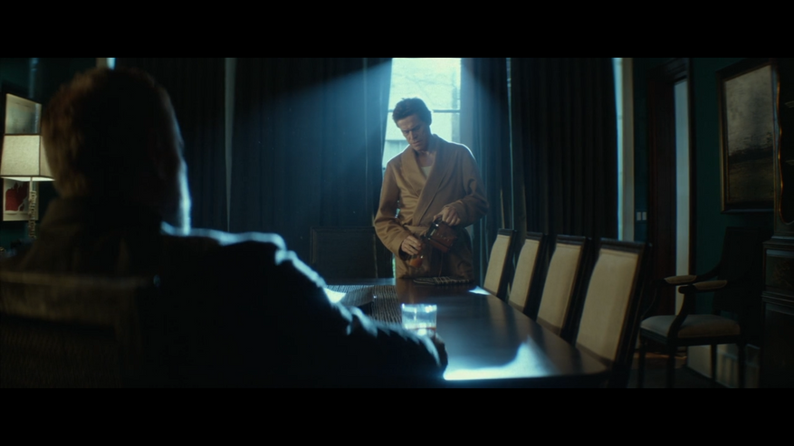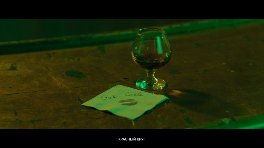 Отдельно предлагаю рассмотреть цвета, которые использует фильм, их значение. Так, основные цвета — это золотой, красный, синий и зеленый. Золотой (желтый, теплый, светло-коричневый) используется как в «интимных» моментах для Уика (воспоминания о жене и сцены с Дейзи, собакой Джона), так и в эпизодах с Маркусом. В своей квартире Маркус одет в светло-коричневый халат, а некоторая часть интерьера тоже выполнена в золотистых цветах. Находясь в отеле, Уик показан в желтой гамме, что намекает на протекцию, а Маркус, находящийся на соседней крыше, тоже окружен в кадре теплым светом или светло-коричневым фоном. Когда Джон попадает в плен к Вигго Тарасову, зритель подсознательно воспринимает сцену как «безопасную» для Уика. Здесь падает четкий желтый свет от прожекторов, огромные окна занавешены светло-коричневыми тканями. И не зря, потому как все охранники находятся на прицеле у Маркуса.