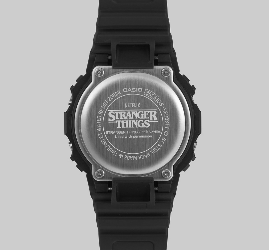 Новинка основана на классической квадратной форме серии DW-5600, но получила тематическое оформление. Циферблат украшен узорами из виноградной лозы, связанных с Векной, одному из злодеев сериала. Надпись «LED BACKLIGHT» содержит перевернутую букву «А», что символизирует двойственность миров, а На тыльной стороне корпуса нанесена гравировка с фирменным знаком культового сериала. На ремешке указано число «011», связанное с главной героиней. Подсветка дисплея активируется кнопкой и светится красным, что соответствует колористике, характерной для «Изнанки». Новая модель поставляется в упаковке с изображением Демогоргона, что подчеркивает их связь с сериалом.