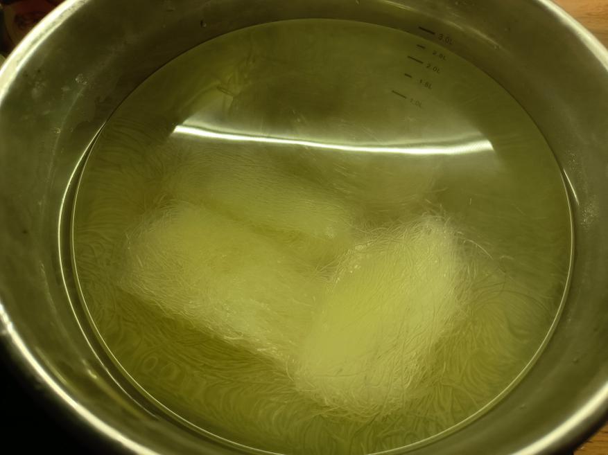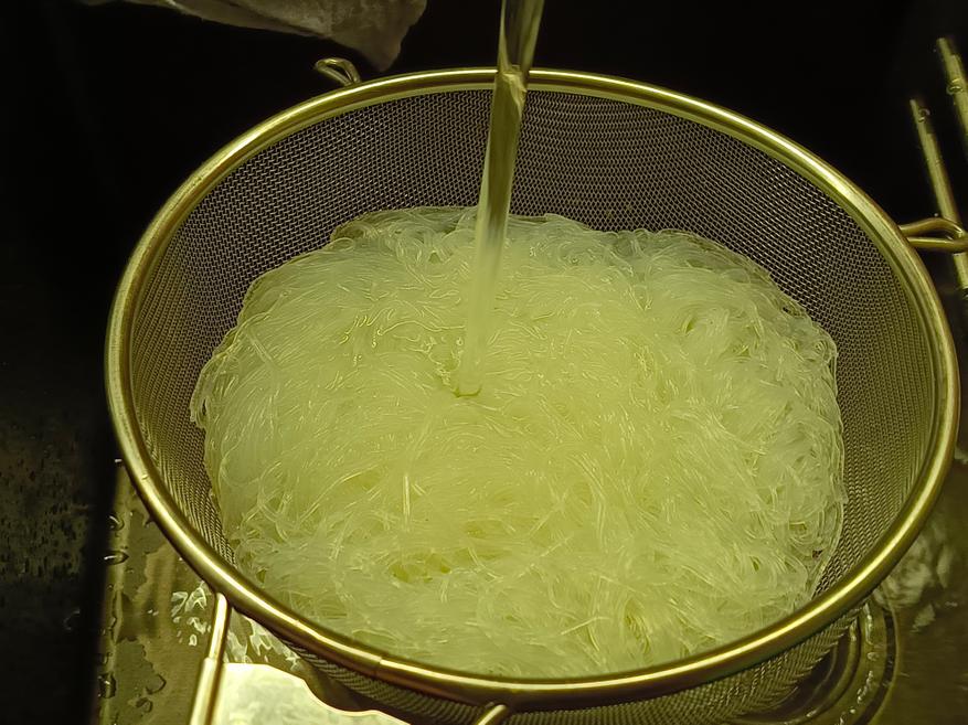 Фунчозу выкладывают в глубокую чашку и заливают кипятком примерно на пять минут. Этого времени вполне достаточно, чтобы она стала мягкой и приобрела нужную текстуру. По истечении указанного времени лапшу необходимо промыть под холодной проточной водой.
