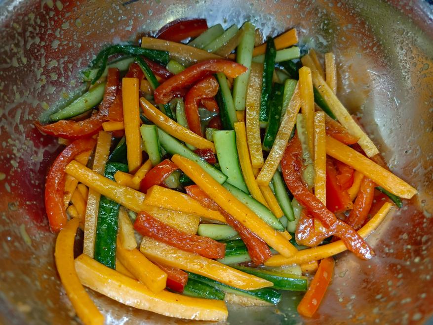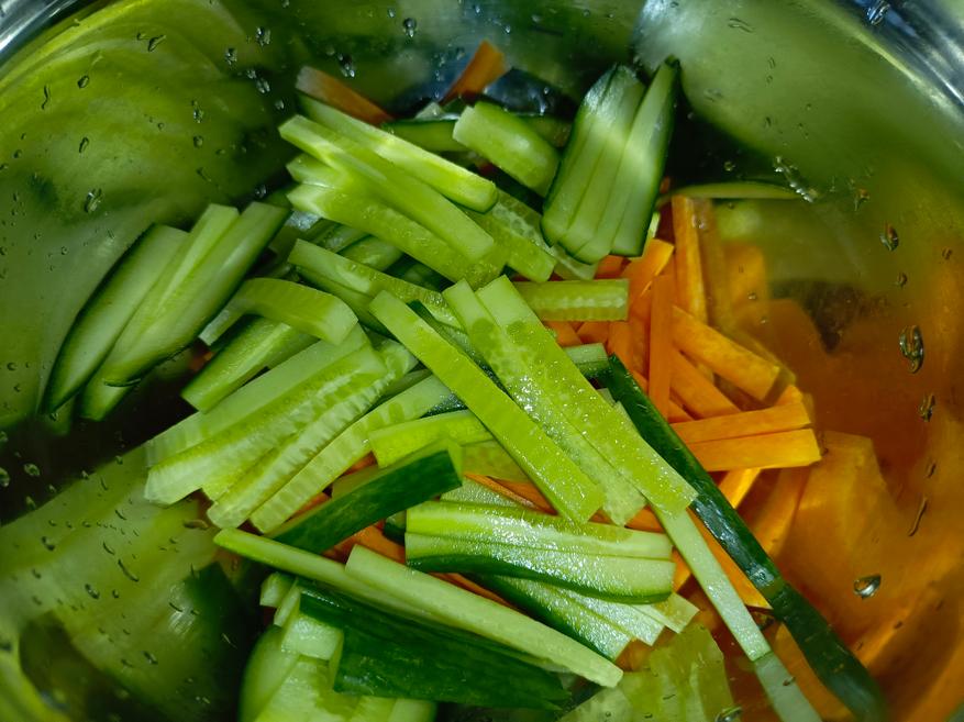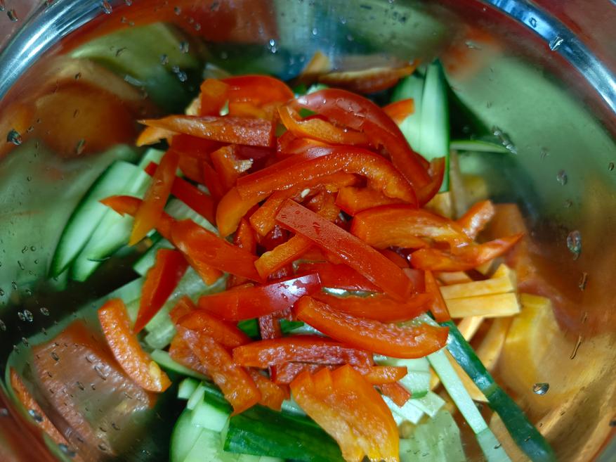 Для приготовления я, разумеется, заранее покупаю саму фунчозу и специальный соус для её приготовления. Дополнительно понадобятся морковь, болгарский перец, огурец и чеснок. Все овощи необходимо нарезать тонкой соломкой, чтобы салат получился нежным и равномерным по текстуре, после чего смешать их и заправить специями. Чеснок следует пропустить через чеснокодавку, чтобы он лучше раскрыл свой аромат.