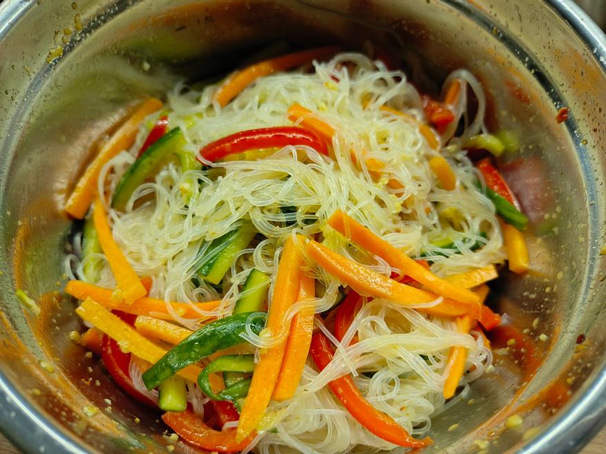 Практически финальный этап — соединение лапши с маринованными овощами вместе с выделившимся соком. Всё тщательно перемешивают и оставляют ещё на пару часов, чтобы фунчоза как следует пропиталась ароматами специй, овощей и соуса. Именно на этом этапе формируется окончательный вкус блюда.