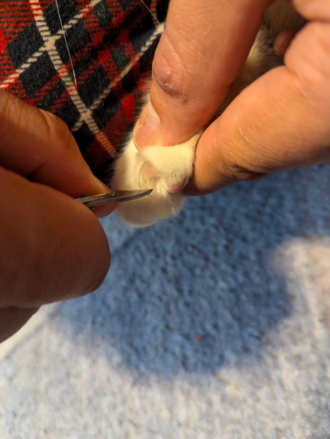 - Изучите устройство когтей в лапах, надавив на подушечку сверху. Обратите внимание, где кончается ороговевшая часть и начинается живая. Живую часть можно отличить по наличию сосудов, её ни в коем случае нельзя задеть.