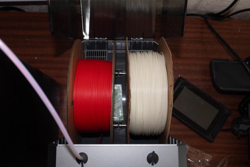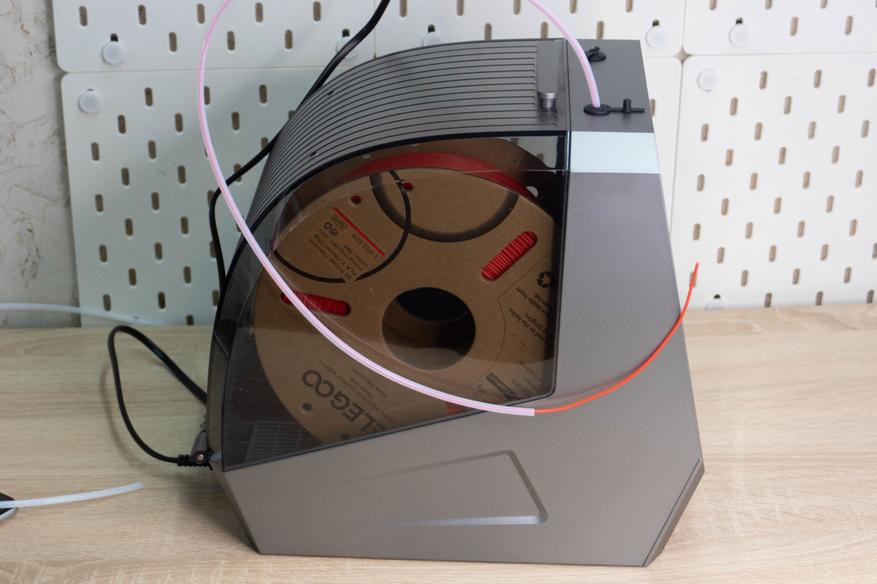 Ну и главный минус, который так же встречается в других моделях, это повышенная температура на выходе контура нагрева. Если выставить нагрев до 70 градусов для ускорения сушки, у PLA филамента могут склеиться соседние витки. Ну и печатать легкоплавким пластиком во время сушки не желательно, т.к. есть риск растяжения во время подачи в экструдер. С ABS и нейлоном таких проблем нет, можно смело пользоваться.