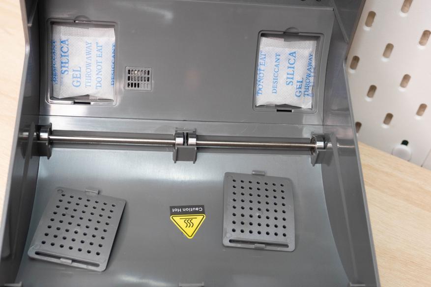 Купол держится на пластиковых петлях, так что фиксируется только в двух положениях: закрыто и полностью открыто. А вот валы металлические и даже подшипники имеются, чтобы катушка могла прокручиваться с минимальным усилием. Справа и слева от окошка датчика имеется две полости, в которых уже помещены пакетики с силикагелем, которые позволят поддерживать небольшой уровень влажности даже при отключении нагрева.