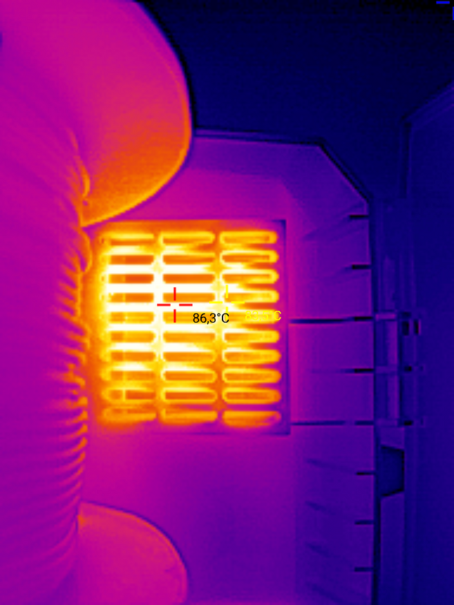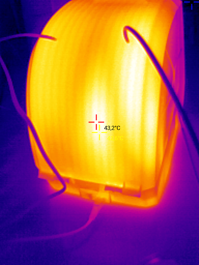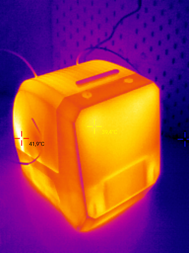 Сзади теплый воздух распространяется по куполу относительно равномерно, есть точки локального перегрева, но разброс не очень большой. А вот температура на выходе не регулируется, контур просто отключается при достижении заданного значения. В итоге потоком цепляет катушку и 80+ градусов может не понравиться легкоплавкому филаменту, например, PLA.