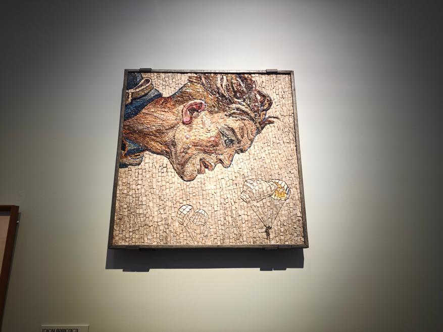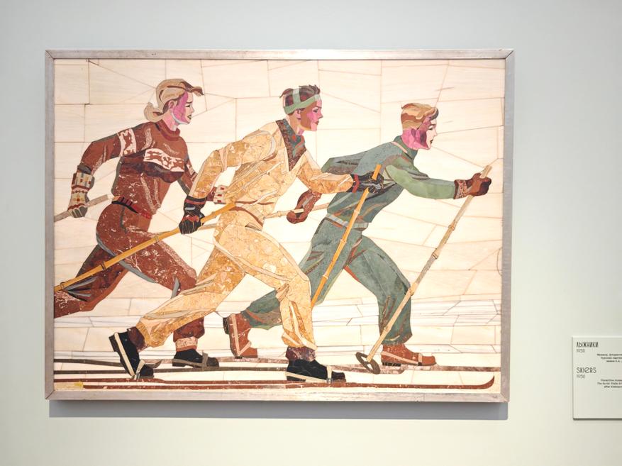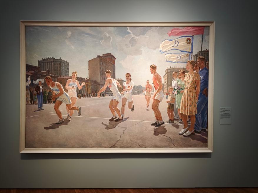 Особенно сильно этот гимн звучит в «рубрике», посвященной спорту, где почти «кустодиевский» великан-спортсмен большой настолько, что ему просто мало холста:
