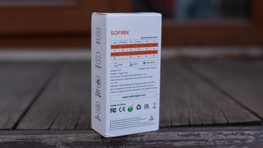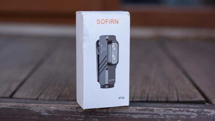 Sofirn ST10 упакован в небольшую белую картонную коробку с изображением самого фонарика едва ли не в натуральную величину спереди и основными характеристиками яркости и времени работы на обратной стороне.