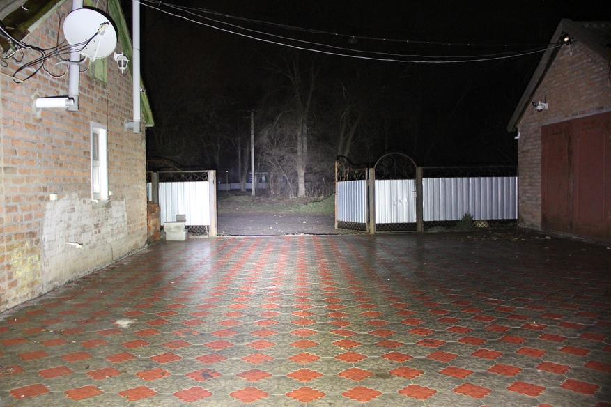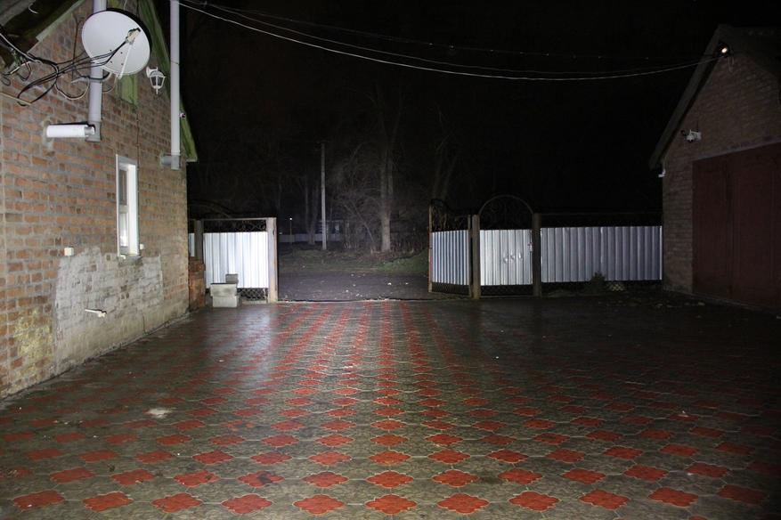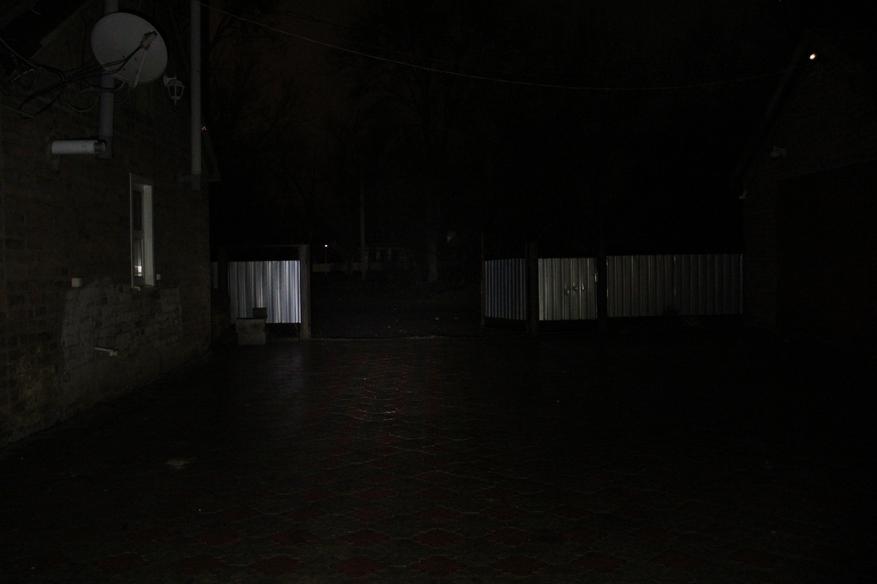 Далее приведу фото на улице. Данные снимки передают ту картину, которую видно глазами, единственное режим Turbo на фото не сильно отличается от режима High, хотя в реальности прибавка в освещенности есть и заметная, правда не в почти 2 раза, как потребляемый ток. До ворот 12 метров, до дерева 36 метров, до дома на заднем плане 108 метров. Производитель заявляет дальность до 250 метров, думаю можно поверить.