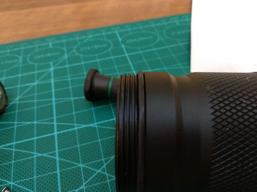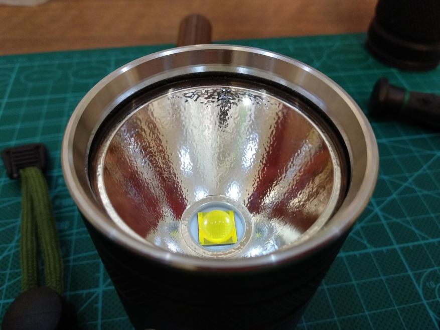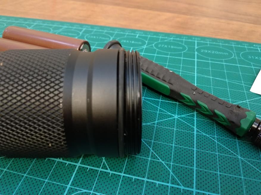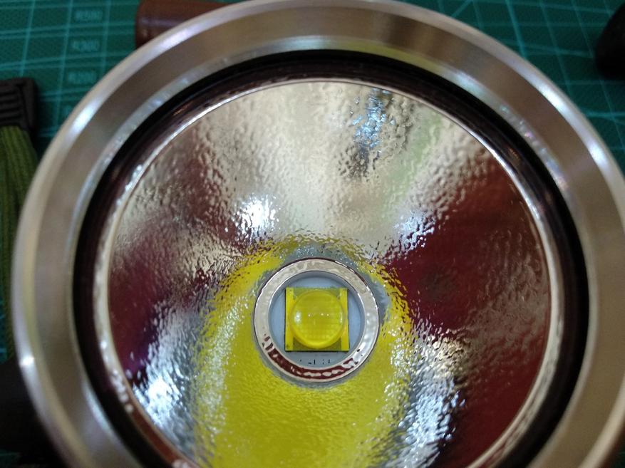 Забыл уточнить: фонарь пришел в картонной коробке (не так как у некоторых, в пластиковом кейсе, хотя у них и светодиод другой), Резьбы имеют обильную смазку (немного уже потерялась со временем), кнопка сделана по ощущениям из алюминия. Ребра охлаждения довольно внушительных размеров. Сам фонарь сделан из алюминия, вес 460гр с аккумуляторами (320 без них), диаметр головы 53мм, длина фонаря 140мм.
