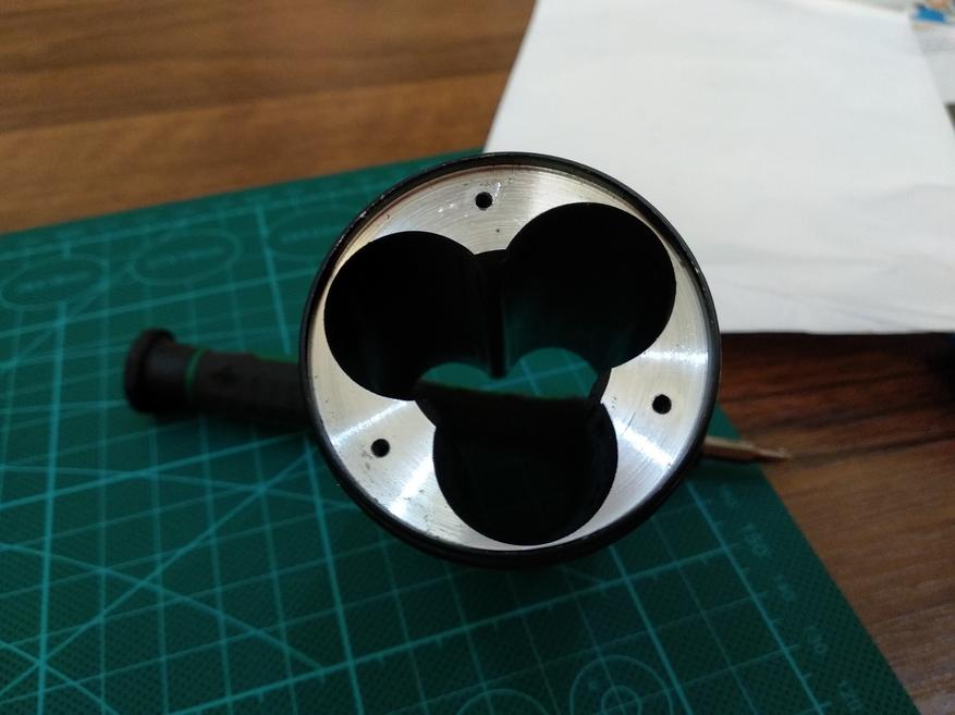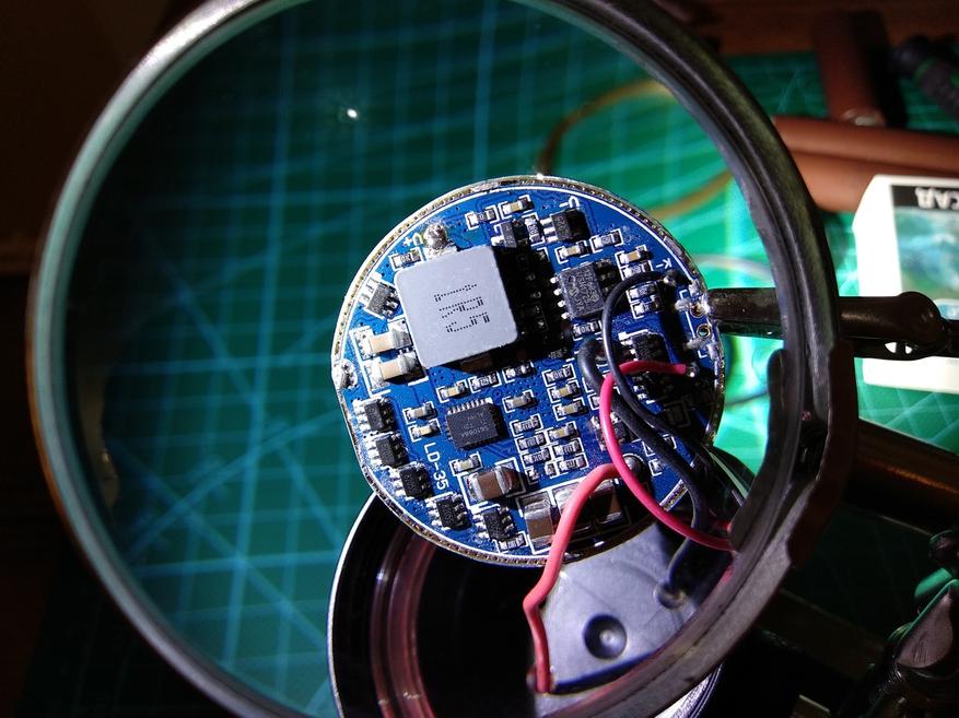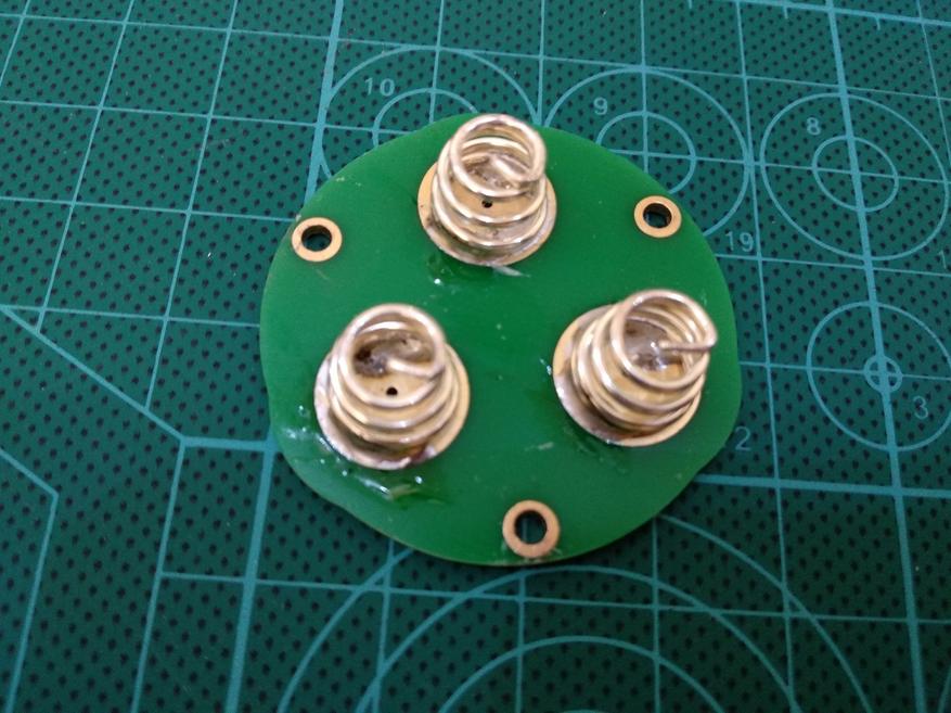 В ручке, как уже было сказано, находится место под три аккумулятора 18650, со стороны минусовых сторон располагаются достаточно упругие пружины, со стороны плюсов пружин нет. Аккумуляторы клеммами упираются в латунное кольцо платы управления-драйвера. Минус на плату подается через корпус фонаря.