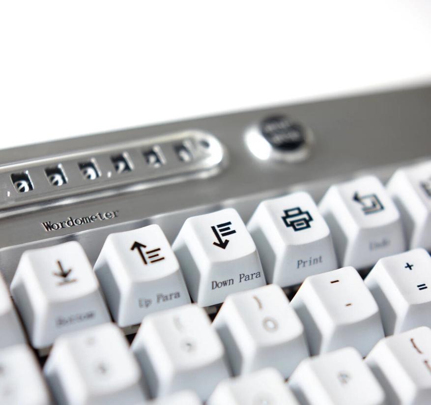 Ряд стандартных F-клавиш заменён на функциональные клавиши для выполнения специфических писательских задач, таких как поиск и замена текста. В левом верхнем углу корпуса расположен джойстик, предназначенный для управления воспроизведением музыки. Конструкция клавиатуры позволяет пользователям самостоятельно заменять механические переключатели и колпачки клавиш.