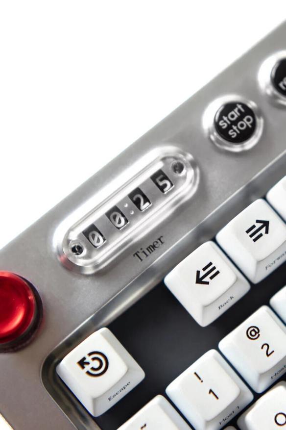 Ключевой особенностью устройства являются два дисплея в его верхней части. Они функционируют за счёт моторизованных вращающихся колёсиков, на которых нанесены цифры от 0 до 9. Такая конструкция обеспечивает тактильную и звуковую обратную связь в процессе набора текста. Первый дисплей выполняет функцию таймера, предназначенного для коротких периодов работы. Его длительность можно устанавливать вручную после каждого сброса.