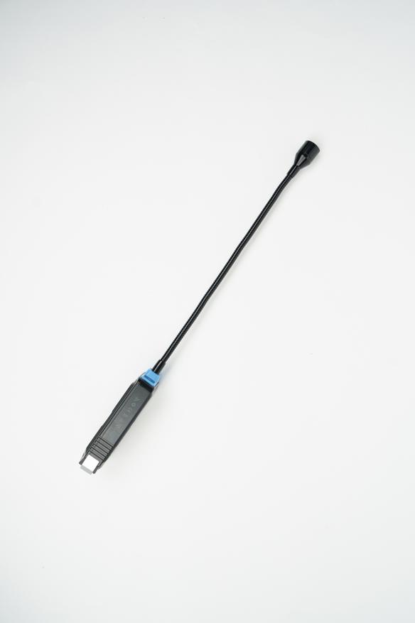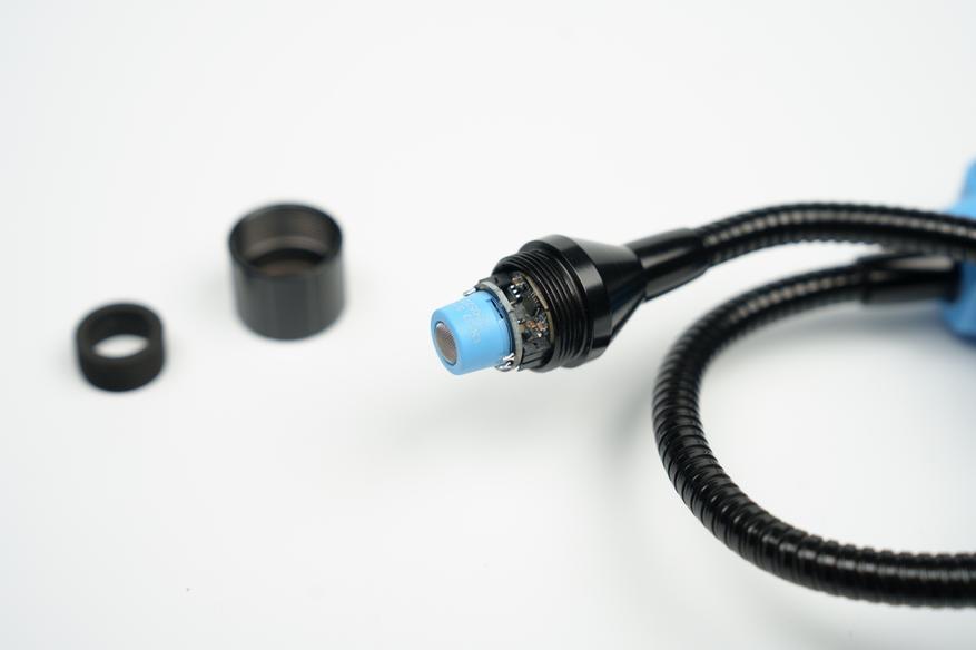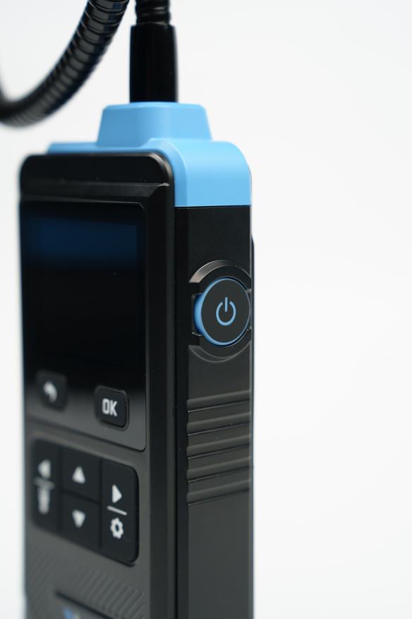На лицевой части находится дисплей, индикатор сигнализации и шесть кнопок управления. На правом торце внутри пластикового кольца расположена кнопка выключения. Практичное решение, чтобы она случайно не нажималась в кармане или сумке. В верхней части выведена гибкая трубка, её длина 36см.