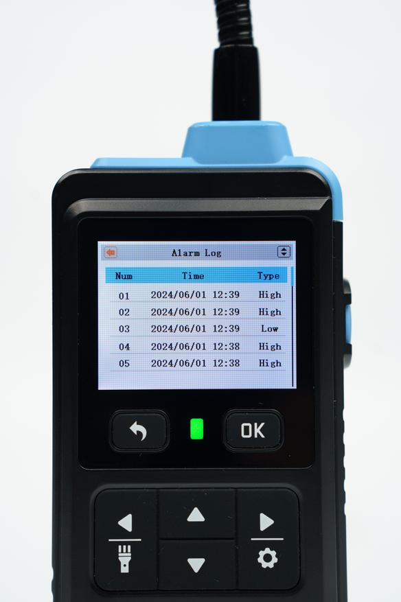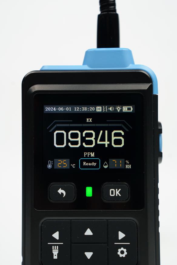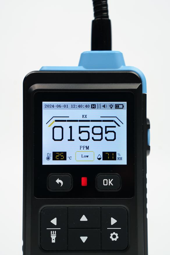 Эта модель позволяет обнаруживать горючие газы, а также сигнализировать о превышении пороговых значений. На цветном дисплее отображается числовое значение в PPM или LEL(НКПР если по-русски) со шкалой уровня, дополнительно можно вывести график изменения показателей и посмотреть логи за длительный период.