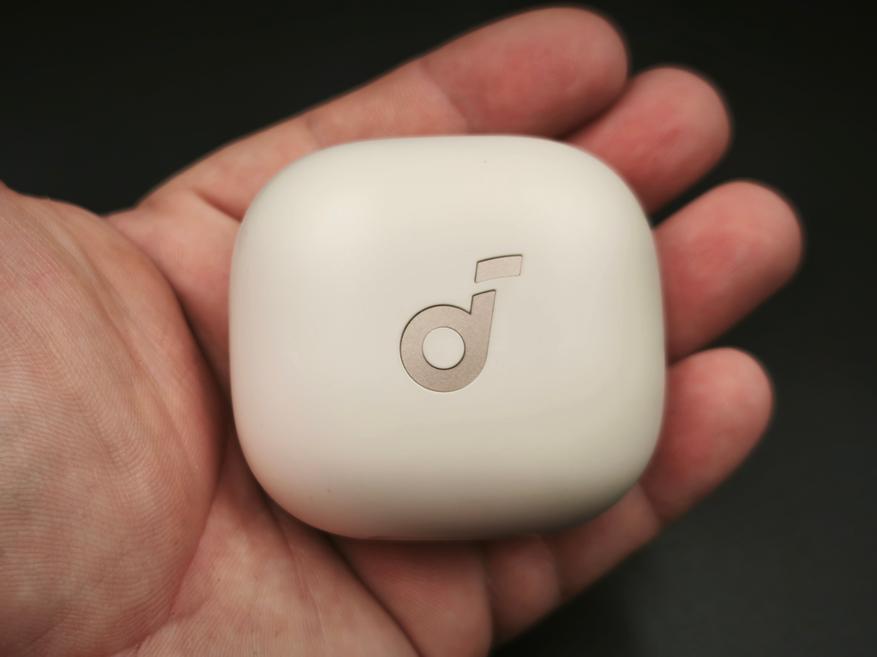 Если взглянуть на кейс наушников сверху, то можно увидеть, что он не имеет острых граней, полностью обтекаемый. Корпус изготовлен из приятного на ощупь пластика, который хорошо показал себя при падениях и устойчивости к царапинам. На верхней крышке кейса нанесен логотип компании производителя, который немного углублен, что исключает его физический износ или стирание при использовании.