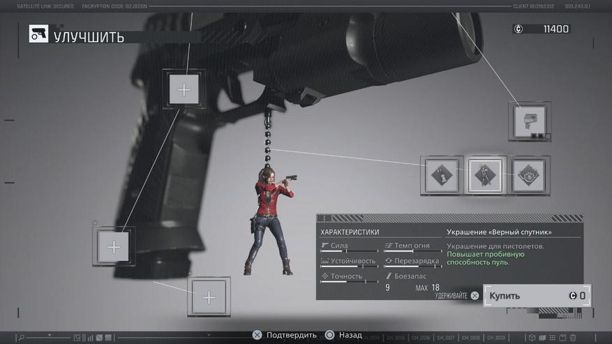 Добавим сюда и бесполезность прокачки. Леон даже в своем первозданном виде на старте уже считается ультимативным персонажем, поэтому любое улучшение оружия не воспринимается и не ощущается как что-то ценное и значимое. Различные брелоки, увеличивающие стойкость или мощь пушек, также различны лишь по описанию, но в бою бонусы остаются незамеченными. По этой причине копящиеся на браслете кредиты за убийство зомби так и остаются лежать мертвым депозитом на счету. Действительно важное усиление — расширение кейса.