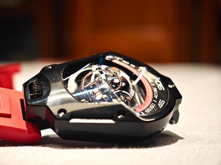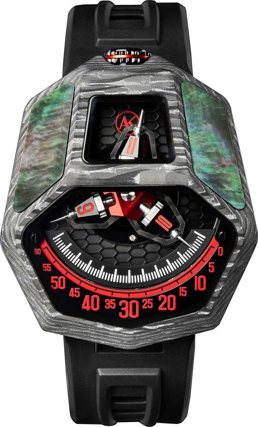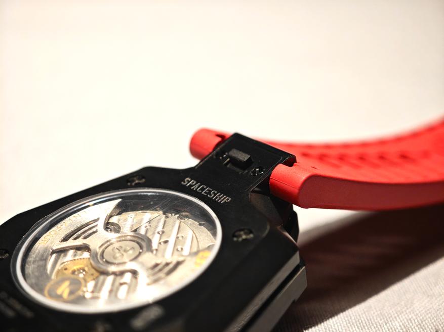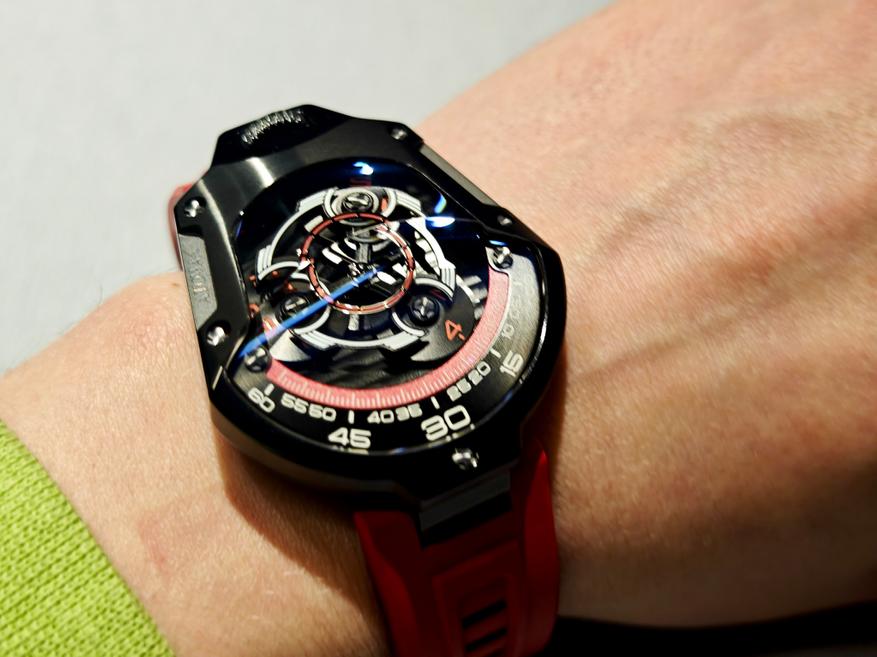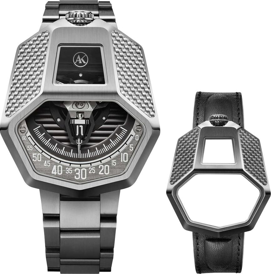 Модель, о которой идет речь, — классические «блуждающие часы» с дисковой индикацией. Часы имеют оригинальную форму, которая отсылает к очертаниям космического корабля.