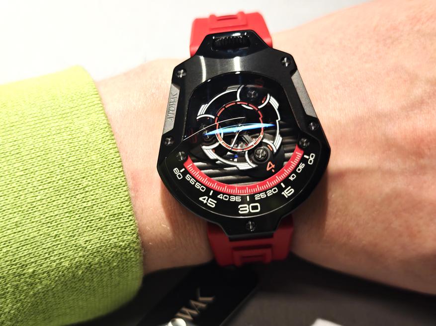 Формально часы остаются «трехстрелочником», но секундная стрелка здесь скорее выполняет декоративные функции, добавляя часам динамики. Ее роль тут выполняет вращающийся диск по центру: