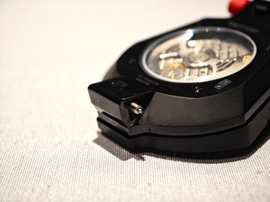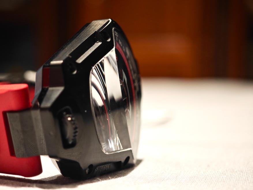 Сам корпус выполнен из стали с PVD-покрытием, он изолирован на уровне 30 метров, а над циферблатом — сапфировое стекло. Стекло это, надо заметить, имеет необычную форму: