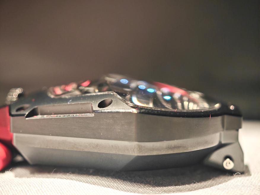 Пользователю остается лишь немного привыкнуть к данному формату, чтобы воспринимать время быстро и безошибочно. Итак, еще раз: наш час от 0 до 60 минут обозначен красной дугой в нижней части. Справа — начало часа, слева — его финал. С началом нового часа около отметки 00 возникает новая цифра, под которой есть небольшой указатель. Итого: сейчас на часах 4 часа 3 минуты. Через 57 минут к дуге подъедет цифра 5. Если приглядываться, то видно, что диски в момент движения плавно вращаются на всех трех основаниях, отчего мы и называем эти часы — блуждающими.