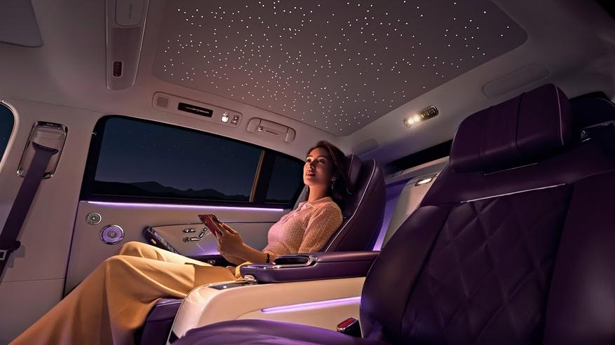 Салон ориентирован на комфорт задних пассажиров. Он включает в себя регулируемые сиденья премиум-класса с интеллектуальной подсветкой, управляемые жестами, и панорамную крышу с опциями создания эффектов звездного неба. Также реализованы системы управления дверьми и защитным остеклением с помощью жестов.