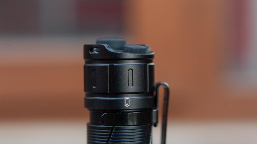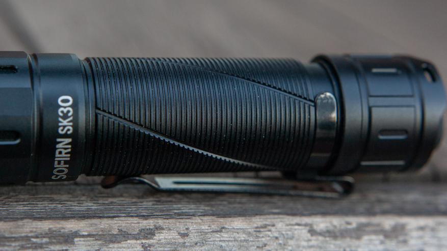 Клипса односторонняя. Не то, чтобы двухсторонняя тут была бы так уж нужна, но, считаю, Sofirn стоило бы сточить пару витков накатки возле головы ради ещё одного посадочного места для клипсы. Мали ли, вдруг кто предпочитает держать фонарик головой вверх.