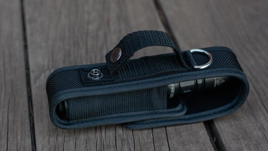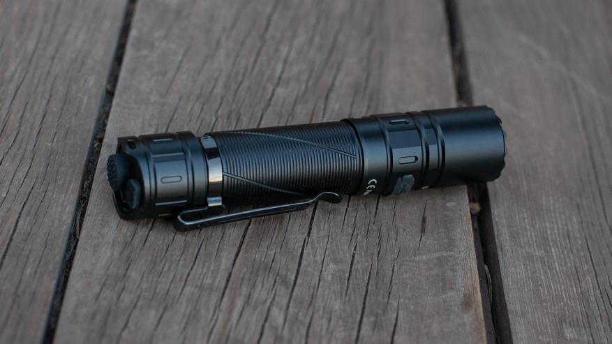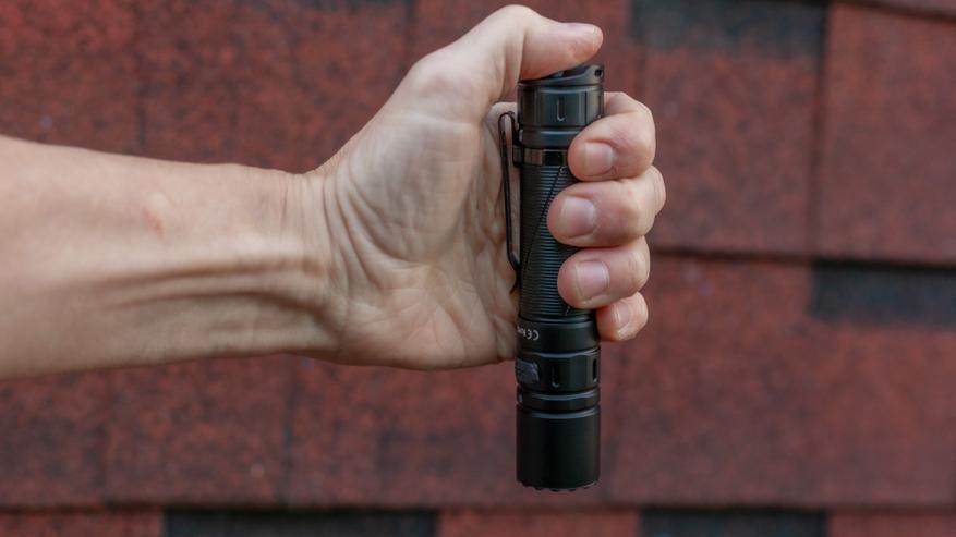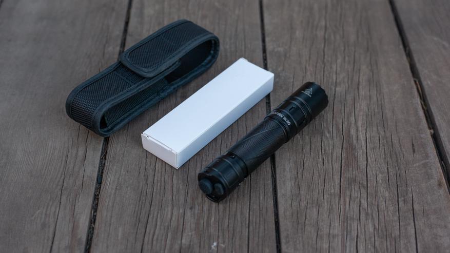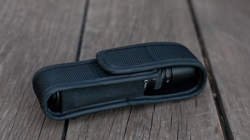 Как тактический фонарик он определённо компактен, особенно, если принять в расчёт питание и вполне проходит по верхней границе EDC-размеров. Голова у него узкая, так что фонарик, при желании, можно носить и в кармане штанов. Хотя при его длине это так себе решение, да и чехол есть…