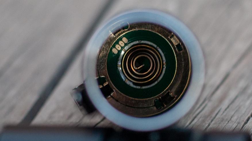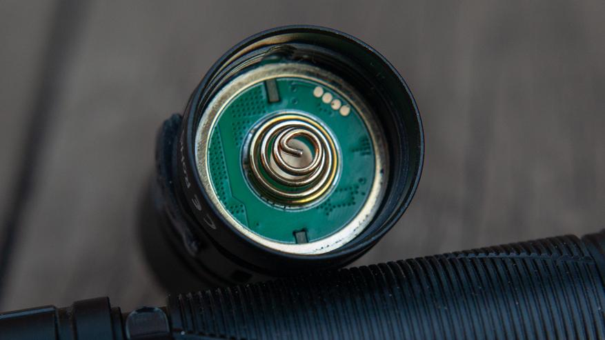Хвостокрышку без термофена ни снять, аккумулятор вставляется со стороны головы. Пружина в хвостокрышке двойная, что хорошо — светодиод-то тут один из самых прожорливых. Тактический фонарик без пружины в голове был бы откровенно странным решением и эта пружина тут есть.