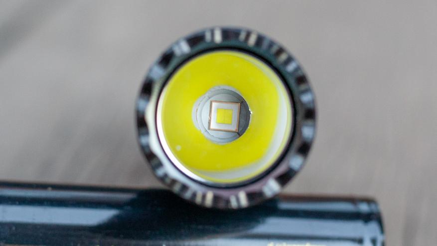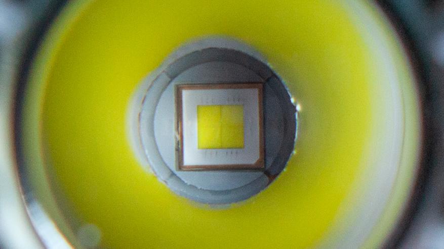 Оптика классическая — неглубокий гладкий рефлектор. И выжать из рефлектора таких размеров заявленную дальнобойность в 374м можно двумя путями: установить какой-то предельно малый дальнобойный светодиод типа SFT25R или же нарастить яркость и в случае Sofirn SK30 производитель выбрал последнее. Тут стоить уточнить, что Luminus SFT70 светодиод не просто большой и яркий, но еще и дедомленный,