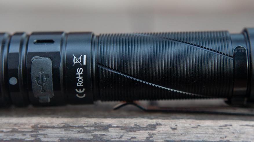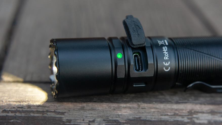 USB-C разъём зарядки находится в голове фонарика. Зарядка тут исключительно долгая — порядка 5 часов. В какой-то момент ток зарядки доходит до 2А, но держится так он недолго.