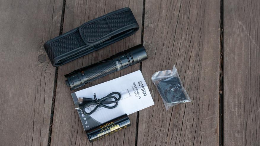 Внутри неё находится ещё одна небольшая белая коробочка USB-C кабелем зарядки, темляком, руководством и уплотнительным кольцом. Неожиданно, неожиданно, но Sofirn положили в комплект и чехол тоже! Внутри него-то и находится фонарик. 21700 аккумулятор ёмкостью в 5000mah, как обычно, внутри фонарика.