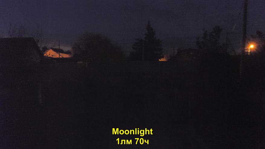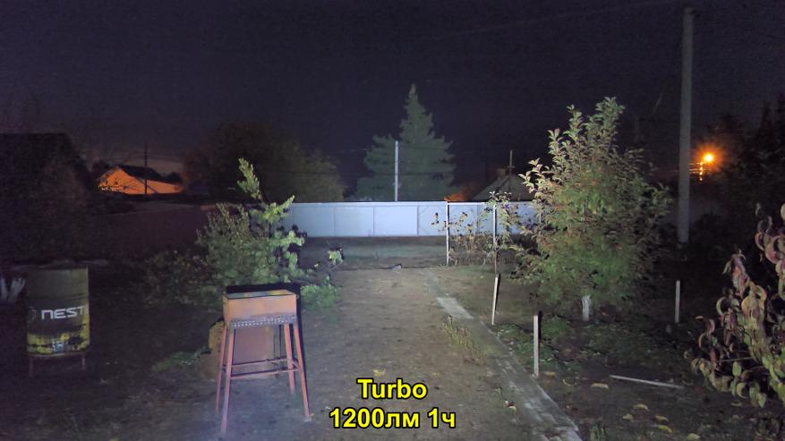 Турбо-режим отличается высокой яркостью и дальнобойностью: заявленная дистанция свечения — до 157 м. Практические наблюдения подтверждают, что реальная дистанция не меньше заявленной: например, на расстоянии 40 м забор освещается превосходно, а расположенная за ним ель видна как на ладони. В этом режиме света действительно много. В то же время режим Moonlight в данной локации практически незаметен.