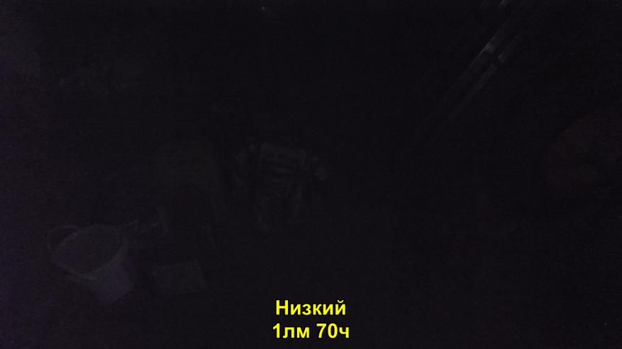 Низкий — световой поток 1 лм, время работы на одном заряде — до 70 часов. В этом режиме дальше 1 метра практически ничего не видно; он подойдёт для очень коротких дистанций.