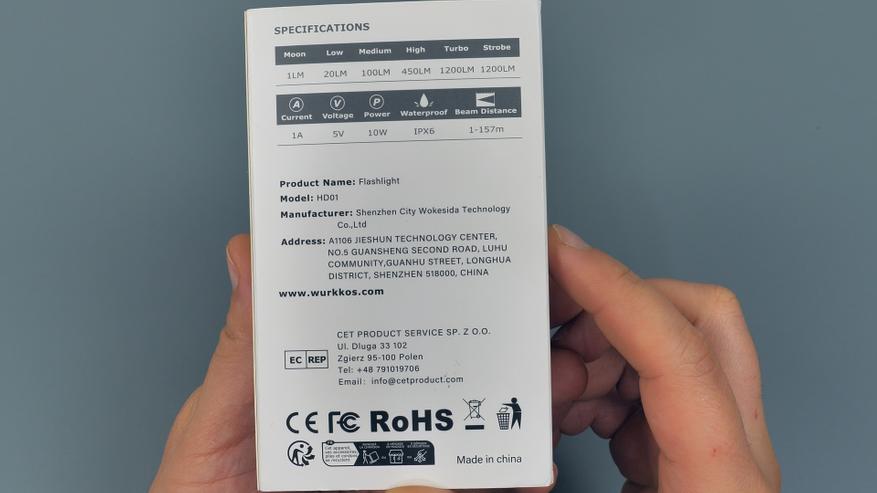 Фонарь поставляется в фирменной картонной коробке, на которой указаны все основные технические характеристики.