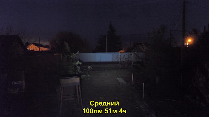 Средний режим: световой поток — 100 лм, дистанция свечения — до 51 м, время работы — до 4 часов.