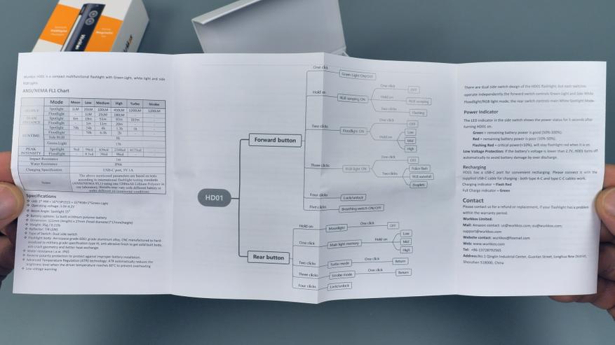 В комплекте с фонарём идёт подробная инструкция пользователя на разных языках, однако русского среди них нет. В инструкции указаны все характеристики фонаря, а также представлен алгоритм управления его функциями. Кроме того, в комплект входит стандартный темляк на запястье для удобной и безопасной эксплуатации фонаря. Также предусмотрен кабель Type-C для его зарядки.