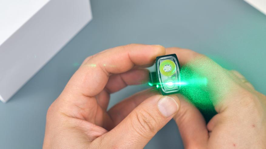 На лицевой стороне корпуса фонаря расположен излучатель с TIR-оптикой, под которым находится светодиод HM с температурой света 6000 К и световым потоком до 1200 лм, а также здесь размещён глазок зелёного лазера.
