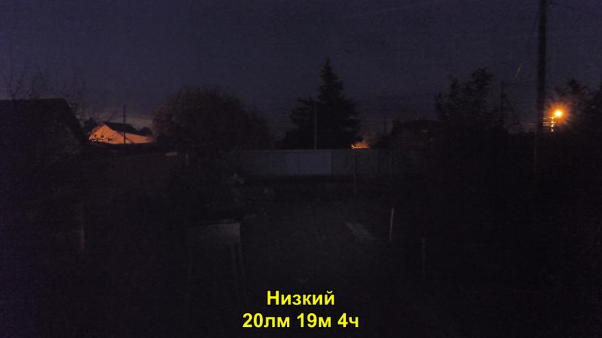 Низкий режим обеспечивает световой поток 20 лм с заявленной дистанцией свечения до 19 м. На практике фонарь достаточно эффективно освещает объекты (например, забор) на дистанции 40 м, причём визуально освещение выглядит лучше, чем на фото или видео. Время работы в этом режиме — до 24 часов на одном заряде.