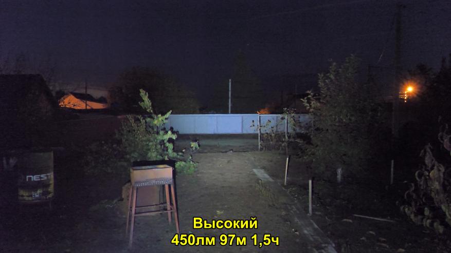 Высокий режим: световой поток — 450 лм, дистанция свечения — до 97 м, время работы — до 1,3 часа.