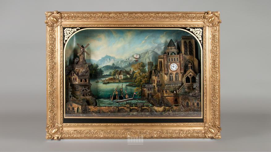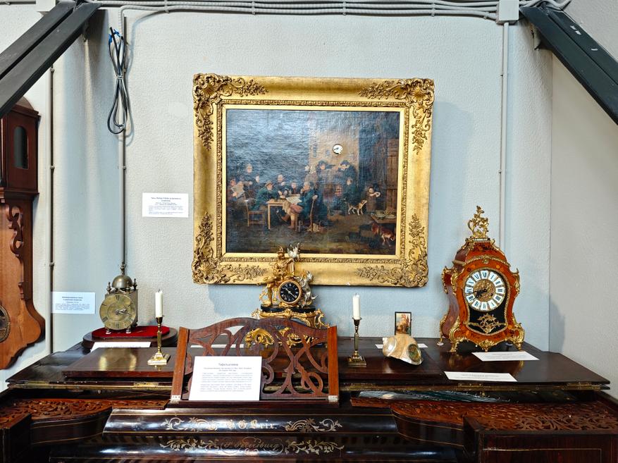 И все же наиболее интересный экземпляр — это часы-картина. Интересна она и с точки зрения «формата», и с точки зрения сюжета. Безусловно, такие картины — не редкость, и даже в этом музее «живописных» часов несколько: