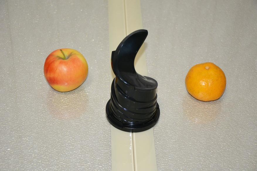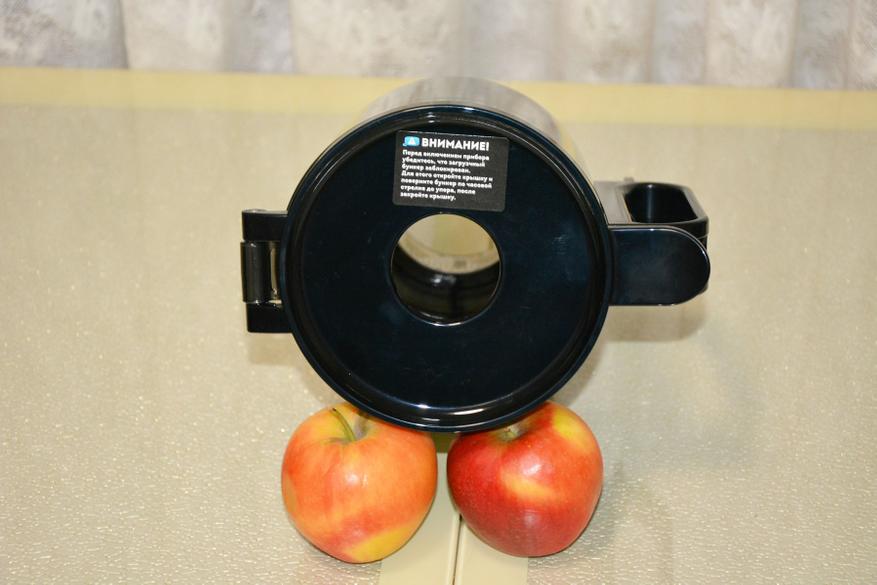 О необходимости закрыть бункер напоминает стикер на крышке, в центре которой имеется отверстие для толкателя, чтобы подправить плоды в бункере. Нижняя часть толкателя сделана из силикона, она гибкая, а сам толкатель внутрь бункера никак провалиться не сможет.