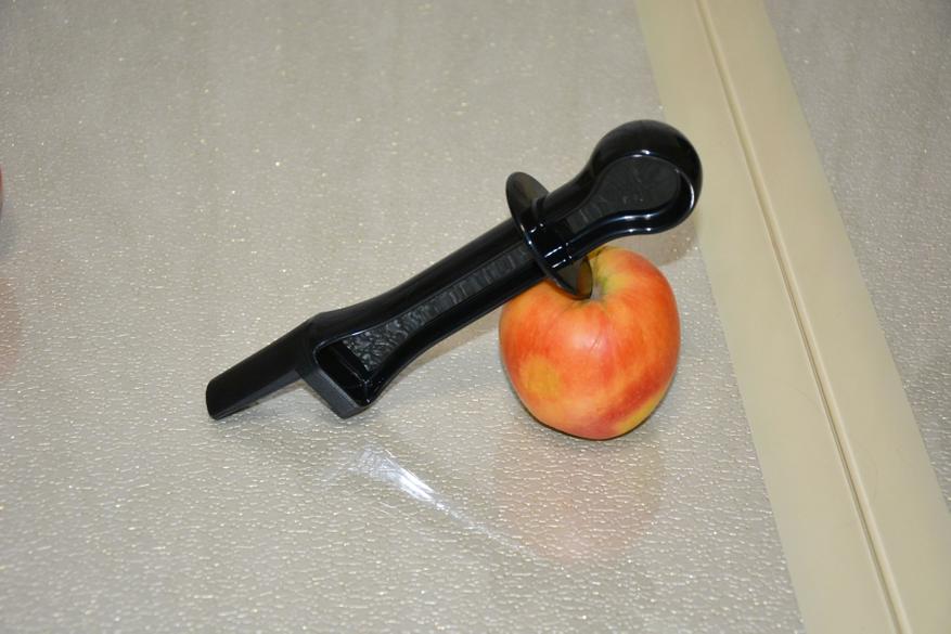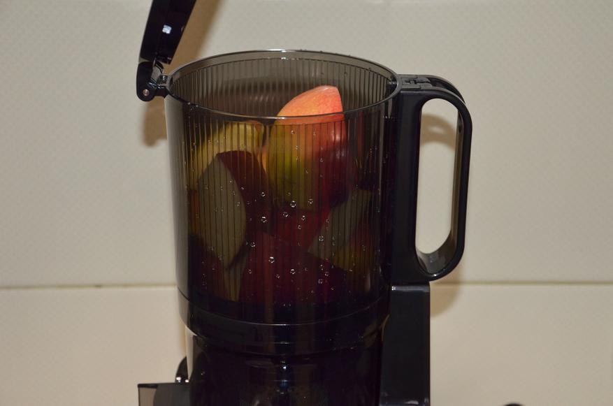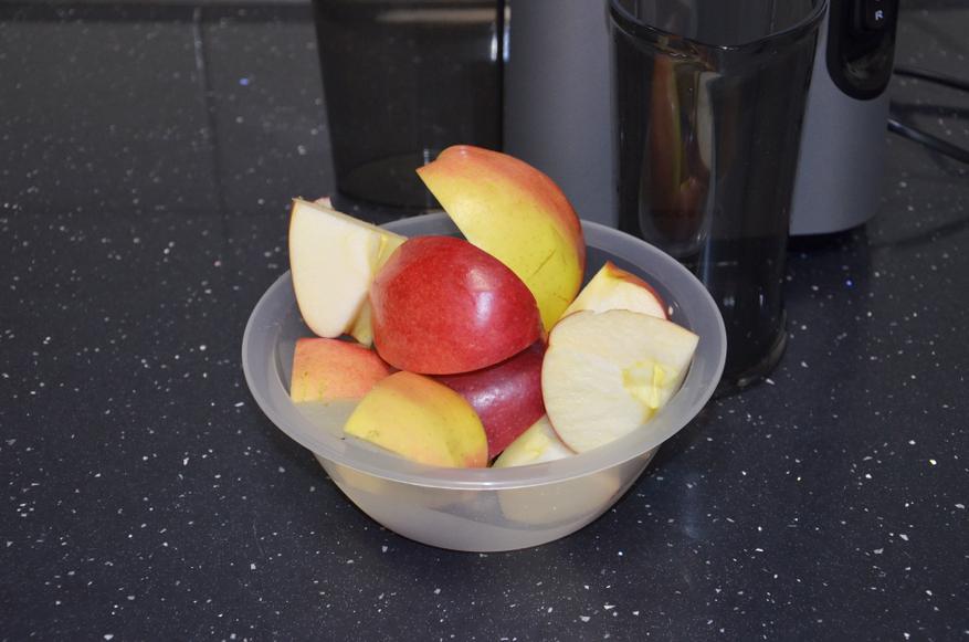 Первыми на испытания напросились яблоки. Хоть можно закладывать их и не разрезая, все же разрезал — яблоки крупные и их влезло бы всего пара, а так загрузил почти по метку максимальной загрузки и прерываться на дозагрузку не пришлось.