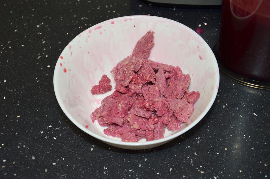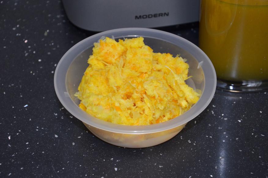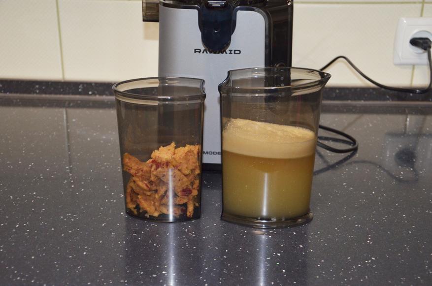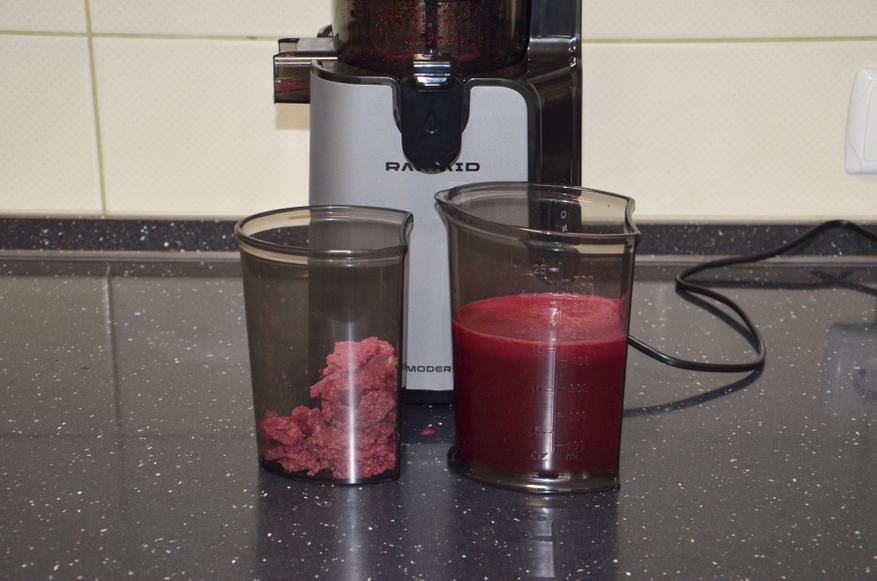 С морковью вообще интересно получилось. В стакан свежий морковный сок, в холодильник отжатая, измельченная морковь для дальнейшего использования. Фракция, как у натертой на мелкой терке, только суше. А вот сама соковыжималка и не поняла, что ей подсунули твердые продукты, работала все так же спокойно, монотонно, без возражений.