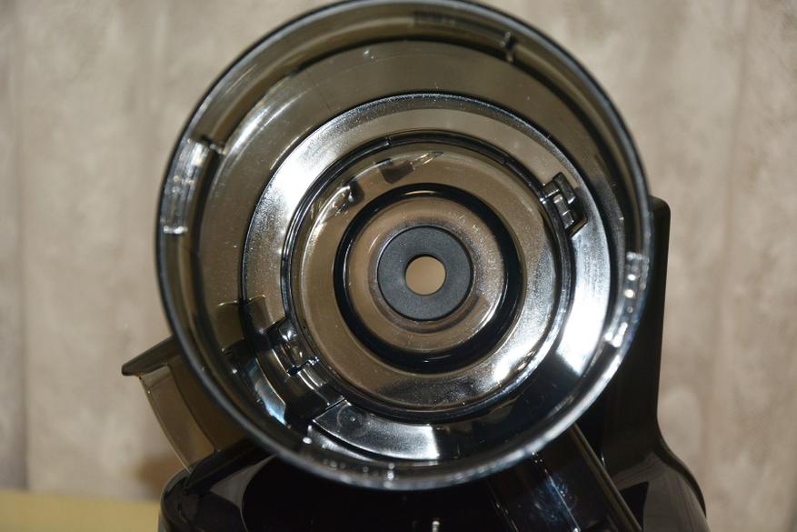 Загрузочный бункер сделан из того же пластика, но стенки его толще. Ребра жесткости присутствуют как в верхней, так и особо выраженные в нижней части, на которую приходится серьезная нагрузка во время работы шнека. В нижней части бункера установлен сетчатый металлический фильтр, легко пропускающий сок, но останавливающий частицы мякоти.