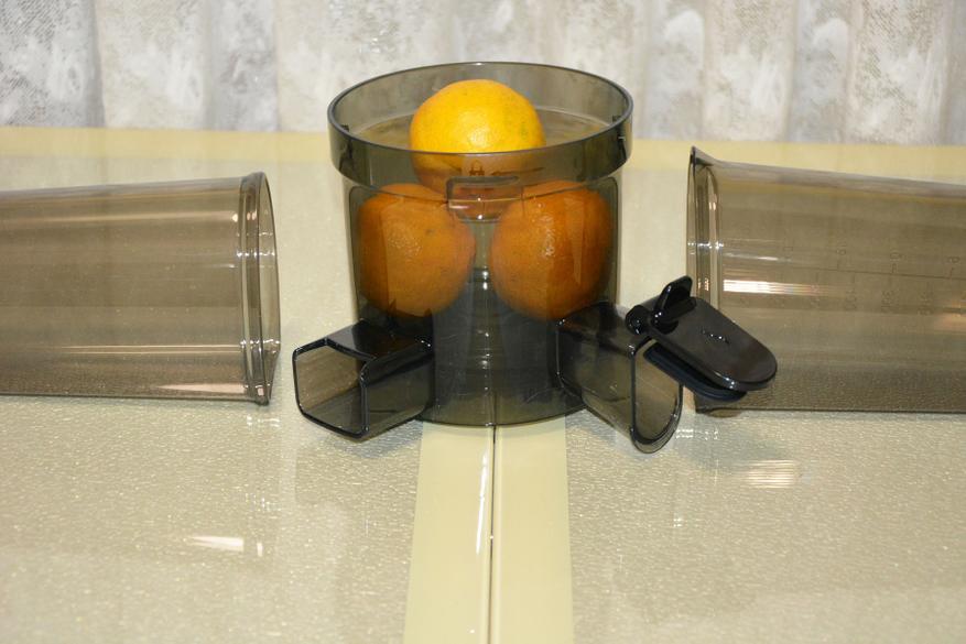 Из соображений непрерывности процесса апельсины также разрезал. Тот же килограмм апельсин и те же пол литра сока на выходе. Из-за кожуры сок получается с горчинкой, но для испытаний соковыжималки вполне. Кстати, кожура добавляет не только горчинку, но и делает жмых заметно более влажным, так как, сама по себе пористая.