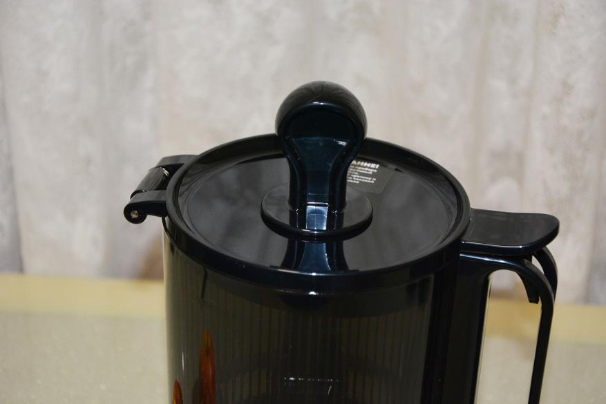 Для удобства установки и снятия бункера предусмотрена ручка с подвижным штоком внутри. Крышка бункера фиксируется защелкой и является частью системы безопасности. Пока крышка не будет закрыта на защелку и вниз не будет утоплен шток соковыжималка не включится.