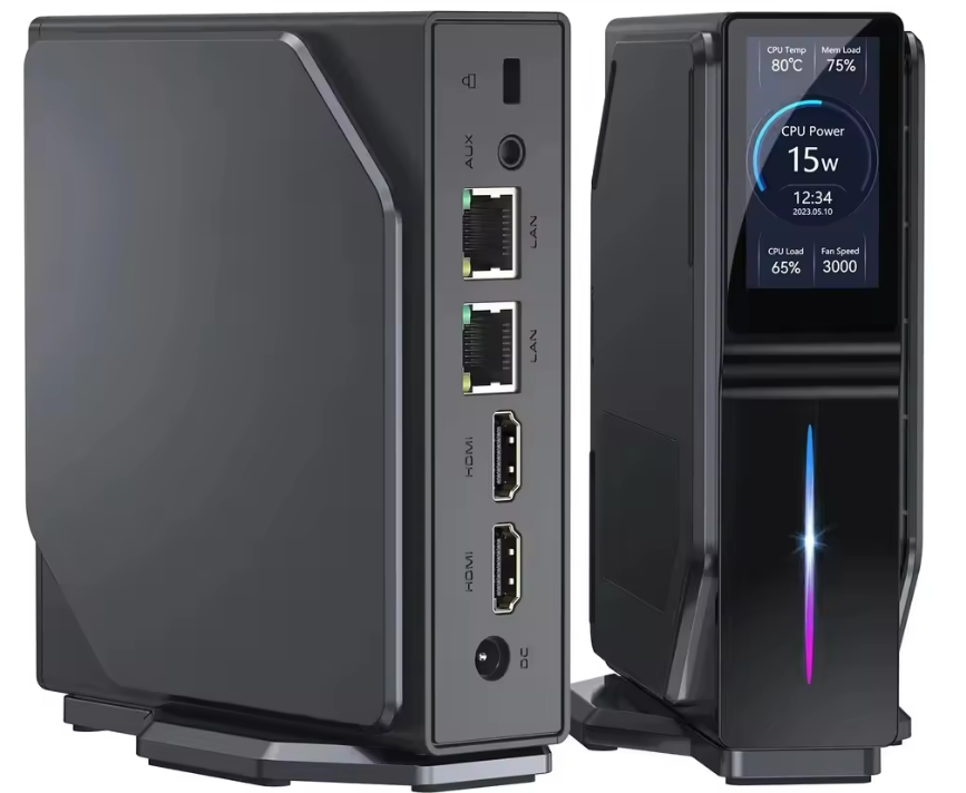 А вот и противоборствующий лагерь подтянулся. В том смысле, что этот компьютер базируется на процессоре Intel N97, энергоэффективном чипе семейства Alder Lake-N, представленного в 2023 году. Его TDP всего 12 Вт, а значит и охлаждение ему нужно не такое шумное, как для 45 Вт решений. Графика уступает интегрированным решениям от AMD и не годится для игр, но легко справляется с мультимедиа в 4K (аппаратно декодирует AV1, H.265 и VP9). 4ядра, 4 потока и 3,6 GHz в турбо режиме. В синтетике (Cinebench R23) мы получаем 971 балл в режиме одного ядра и 2913 баллов в многоядерном режиме. Этого хватает для любых повседневных задач, обучения, работы с фото, видеомонтажа (в том числе с поддержкой аппаратного ускорения Intel QSV). А еще этот «камушек» недорогой, соответственно и компьютер вышел очень доступным. Из необычного можно отметить пару моментов. Первая фишка — откидная боковая крышка на магнитах. За ней расположены слоты для оперативной памяти и два разъема М2 для NVMe накопителей. Второй момент касается небольшого информационного экрана на лицевой части, куда выводится время, а также дополнительная информация о нагрузке процессора и памяти, температуре, скорости вращения вентилятора