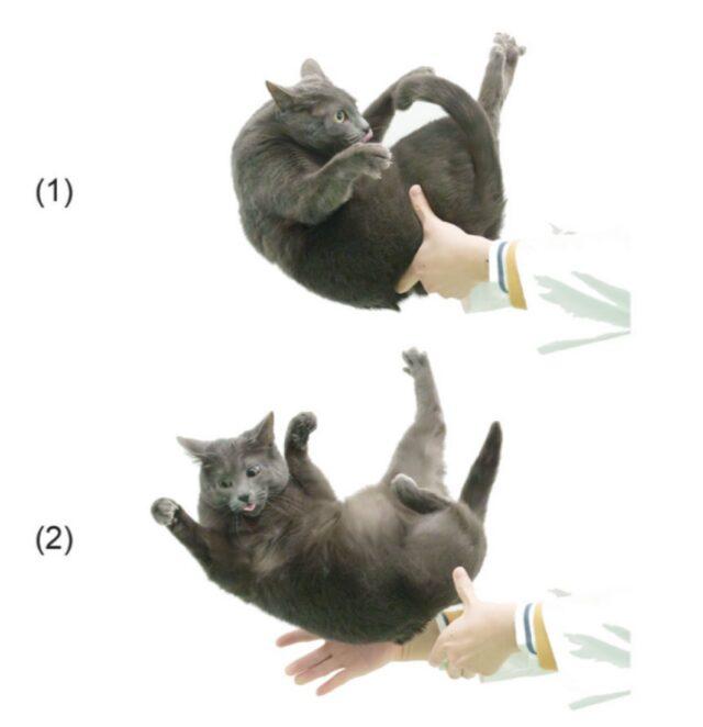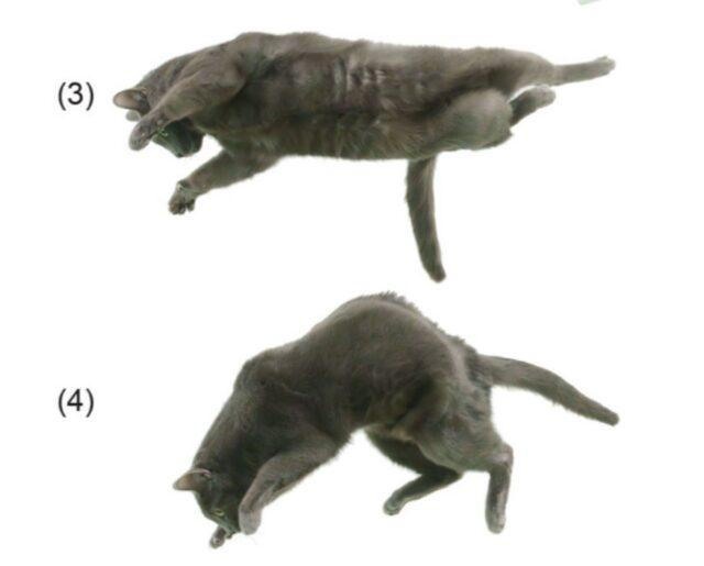 Параллельно исследователи провели серию высокоскоростных съёмок. Двух кошек сбрасывали с небольшой высоты по восемь раз каждую. Анализ фотографий подтвердил: животные сначала поворачивают голову и переднюю часть тела, используя гибкость верхнего отдела позвоночника, затем подтягивают передние лапы и выпрямляют задние.